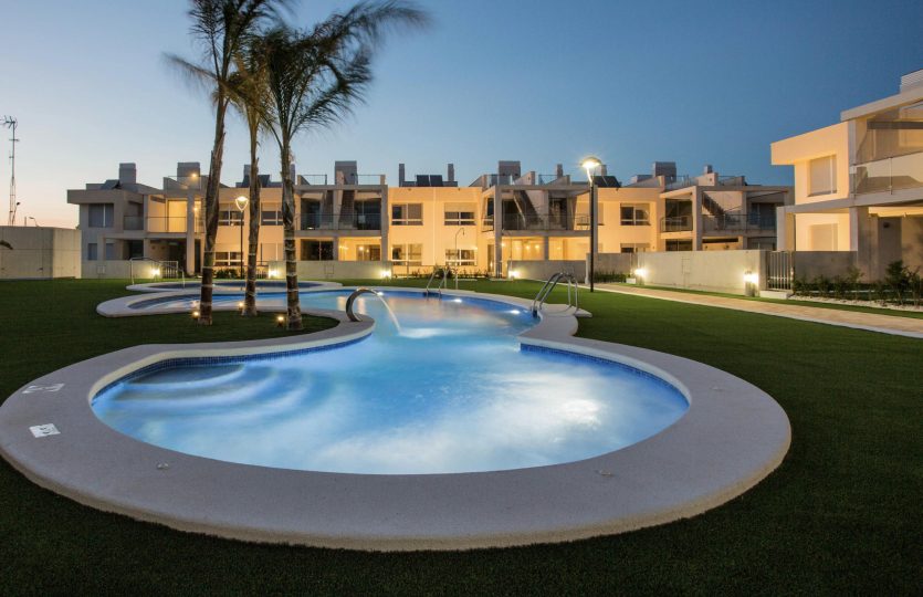 De buitenruimtes bestaan uit een groot balkon, gemeenschappelijk zwembad, tuin, privéparkeerplaats en berging.