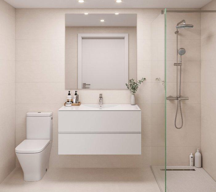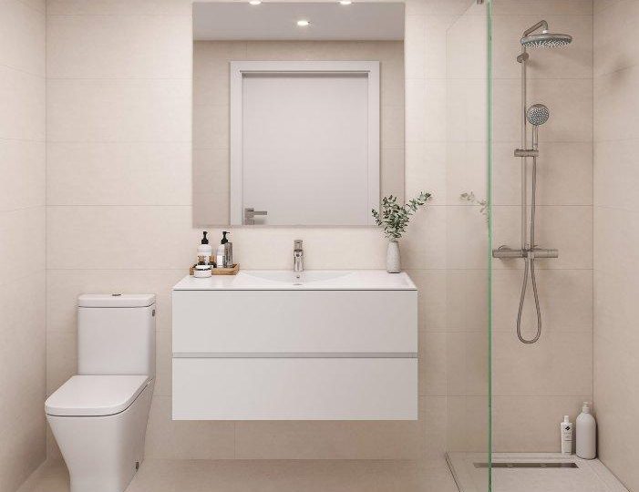 De badkamers zijn compleet met wastafel, kast, spiegel en douchescherm.