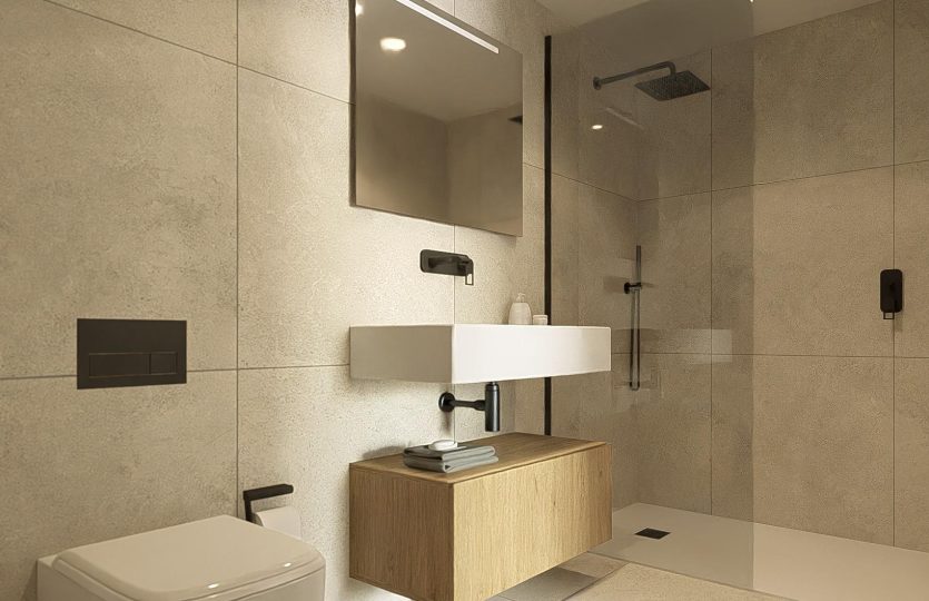 Slaapkamers met toegang tot het balkon en uitzicht op het zwembad. De badkamers worden compleet opgeleverd en zijn vervaardigd met materialen van uitstekende kwaliteit.