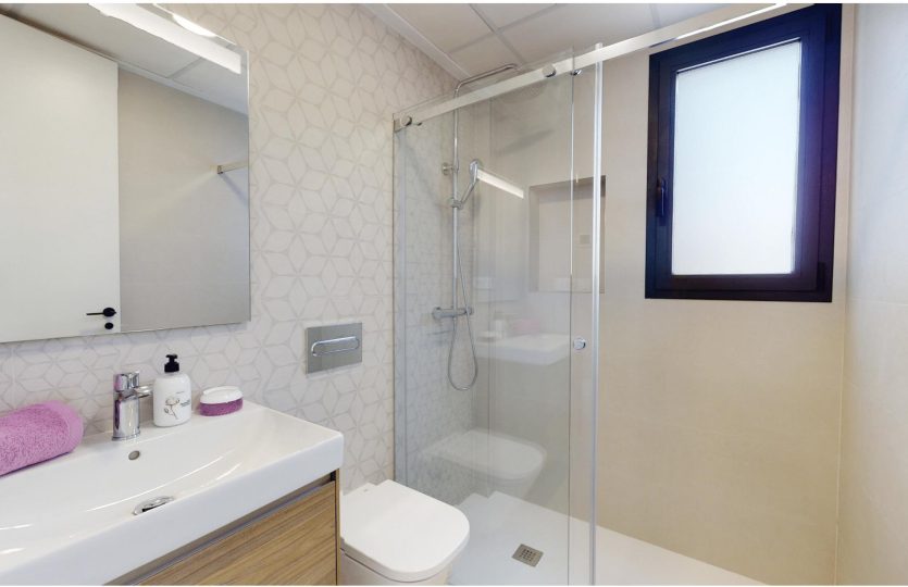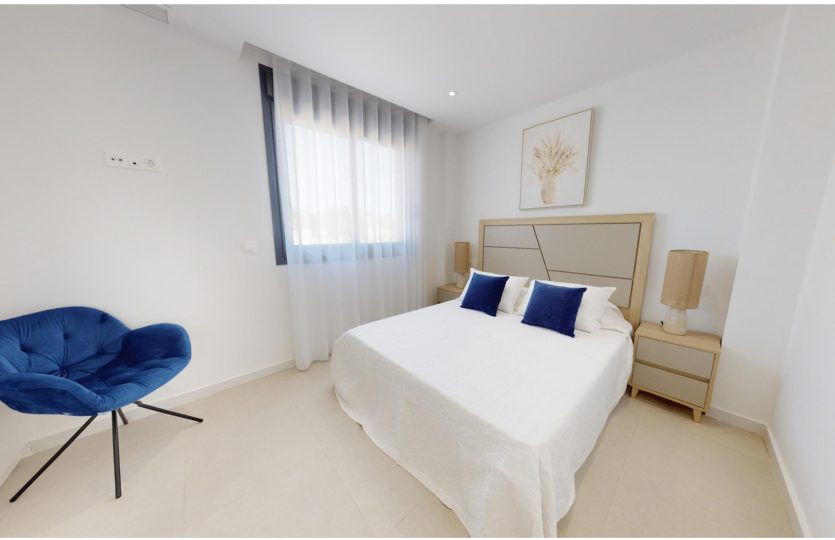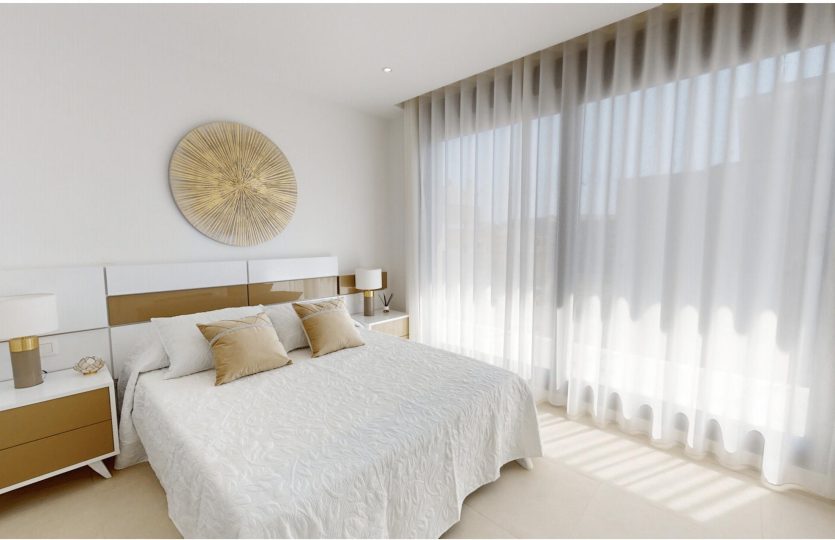 De slaapkamers zijn voorzien van inbouwkasten afgewerkt in glad wit hout met schuifdeuren, dubbele beglazing en elektrische zonwering.