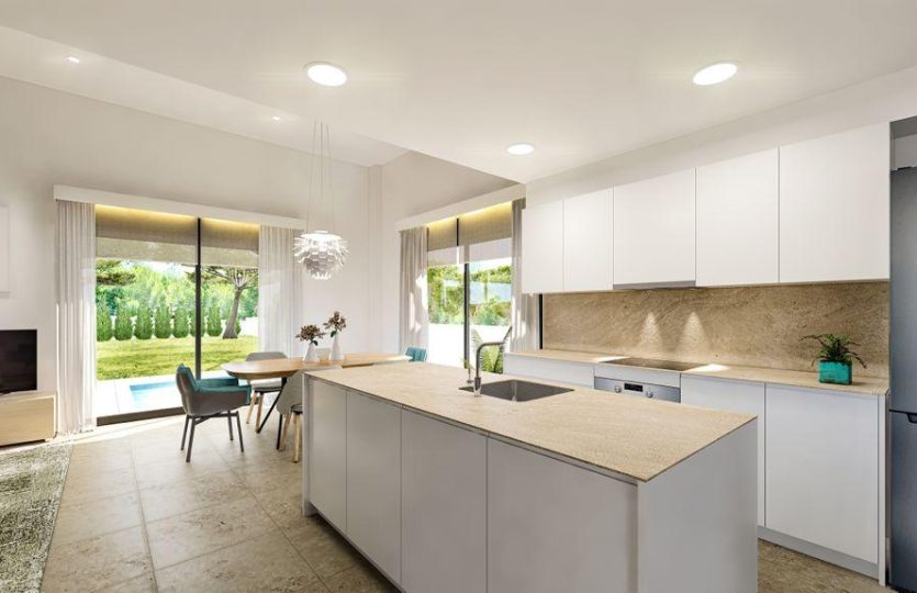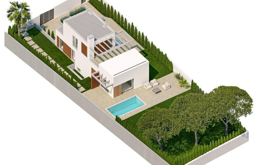 Wat betreft de buitenruimtes, de villa’s worden opgeleverd met een afgewerkte tuin en privé zwembad.