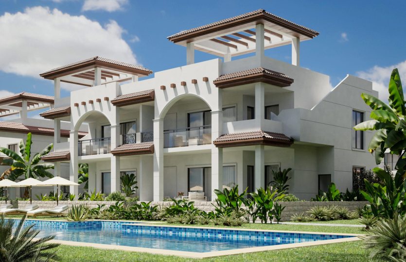 Appartementen op de begane grond met twee slaapkamers en twee badkamers volgens moderne en frisse ontwerpen. Gesitueerd in een privéwoonwijk met grote groene zones.
