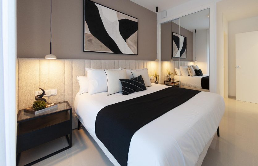 De slaapkamers zijn ruim en voorzien van moderne witgelakte kledingkasten. De badkamers worden compleet opgeleverd met wastafel, badkamermeubel, spiegel en douchescherm. De appartementen zijn tevens voorzien van airconditioning en een installatie voor warmwatervoorziening voor huishoudelijk gebruik.