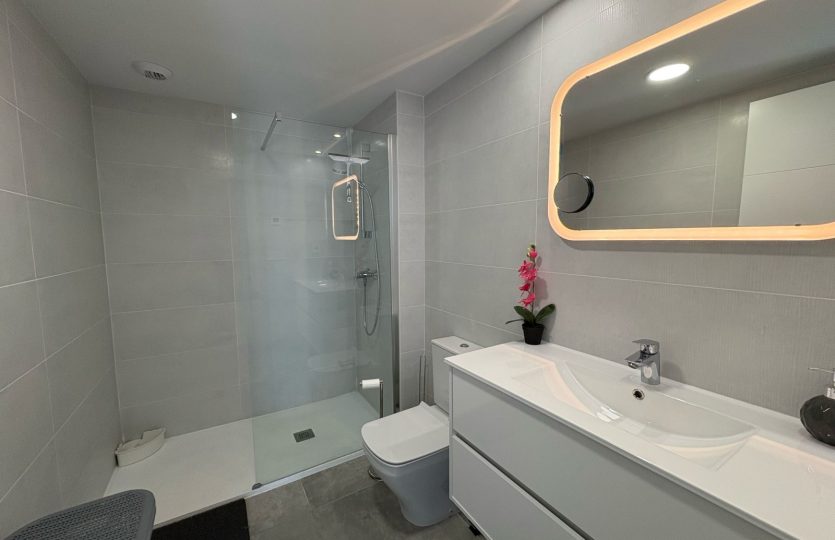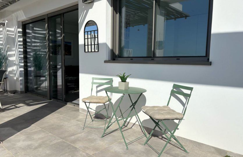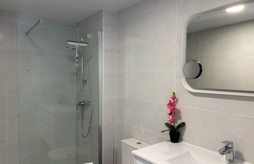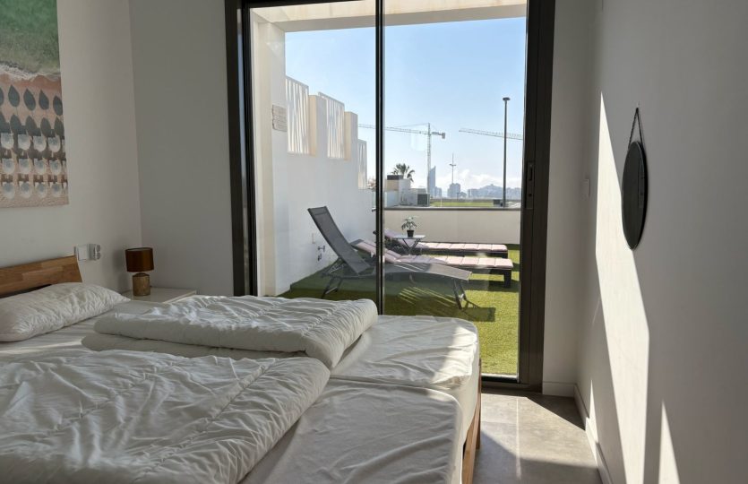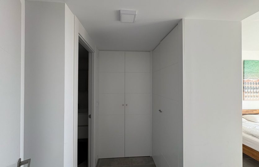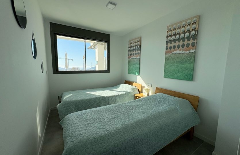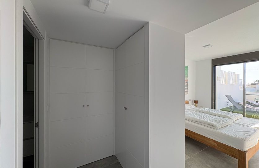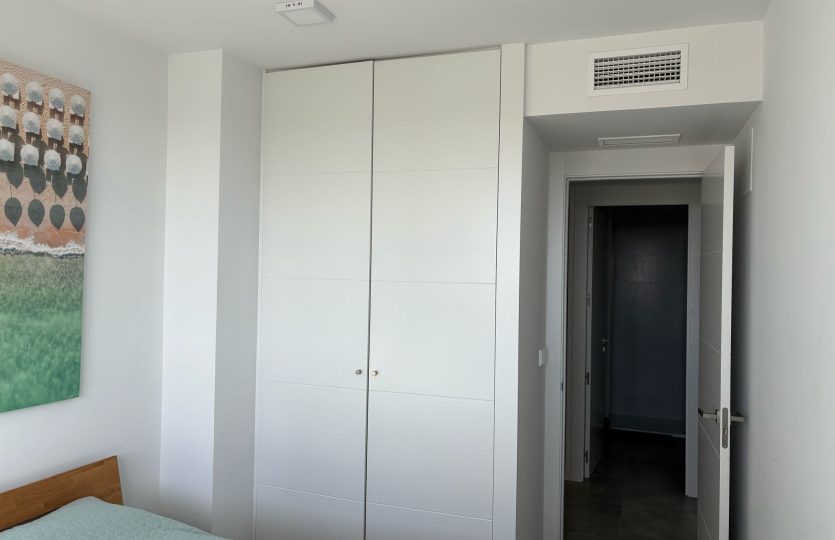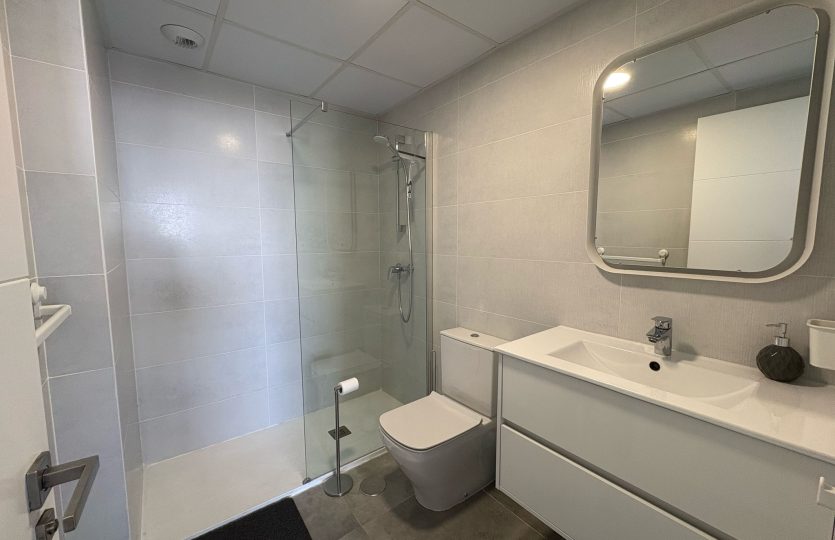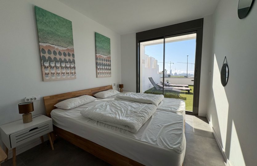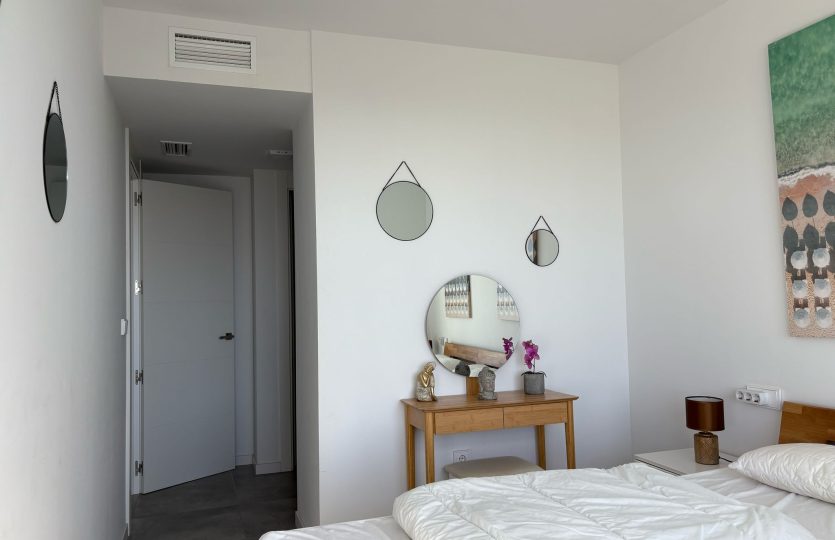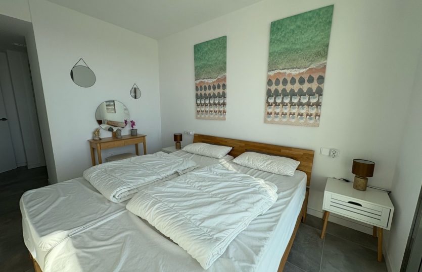 De woning bestaat uit 2 slaapkamers en 2 badkamers. De hoofdslaapkamer is en-suite, heeft directe toegang tot het terras en een ruime inloopkast. De tweede slaapkamer heeft ingebouwde kasten.