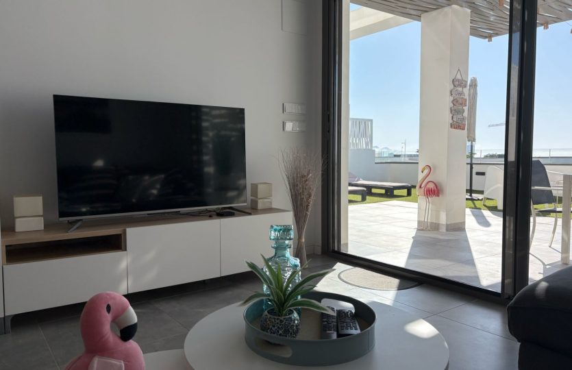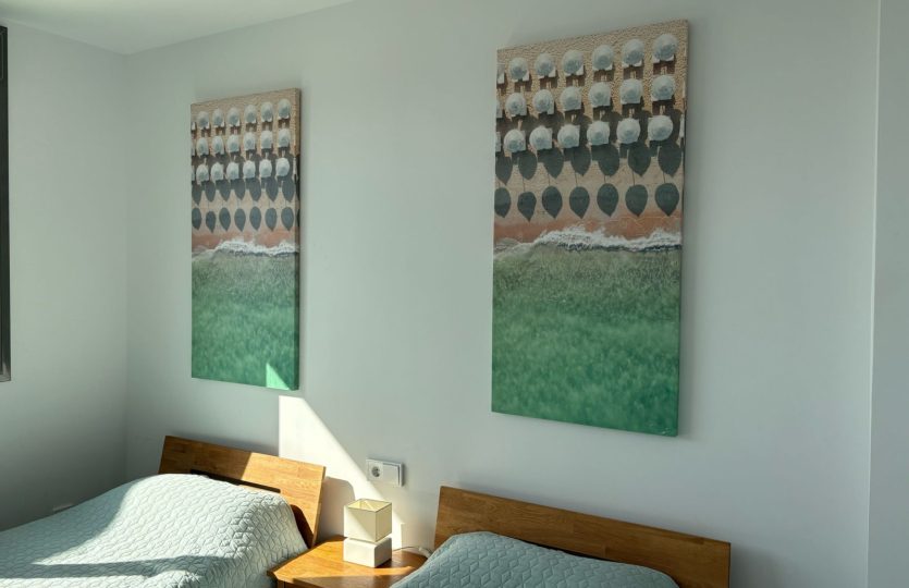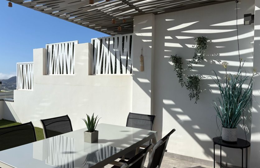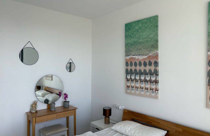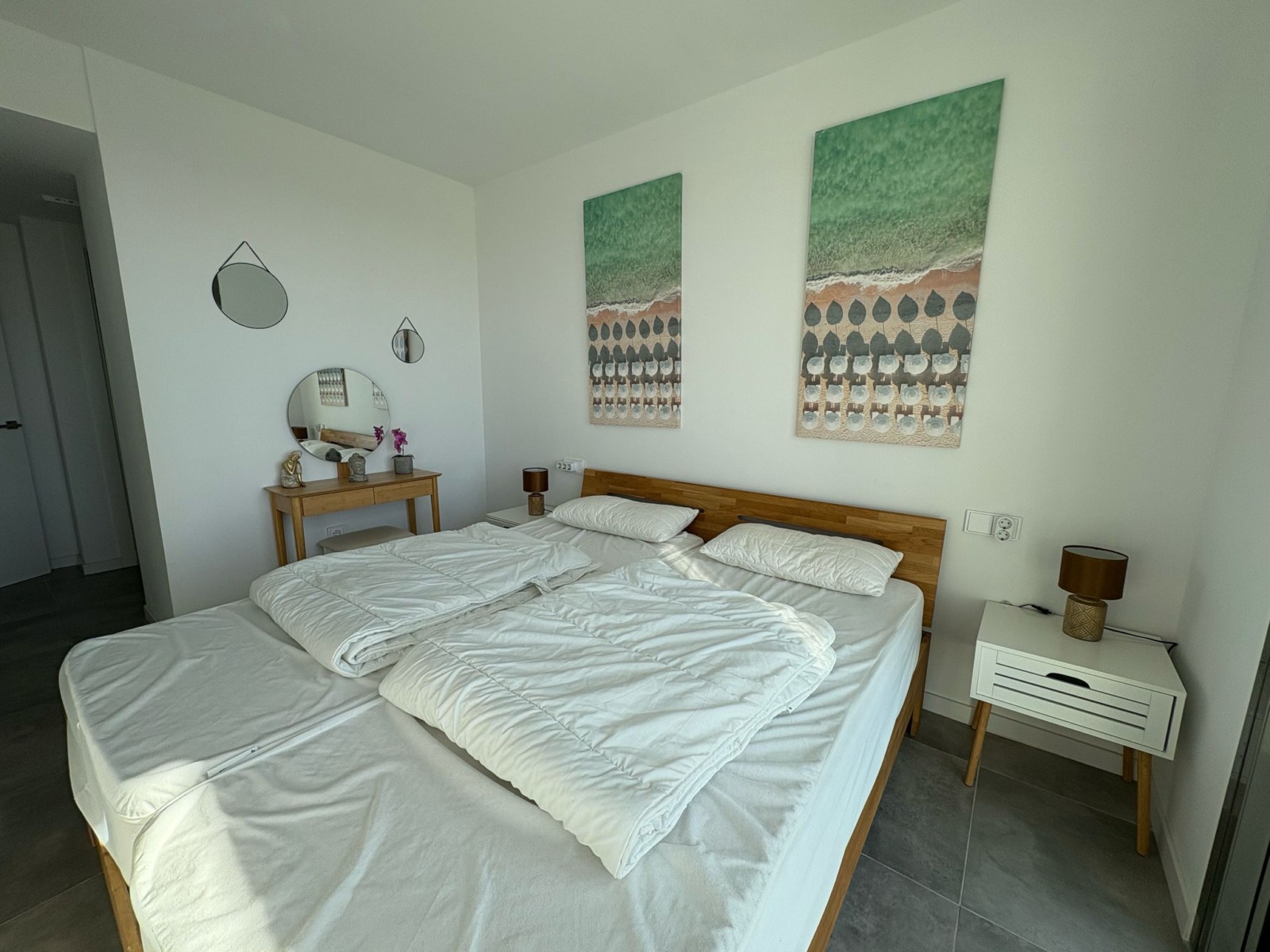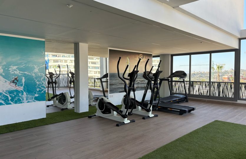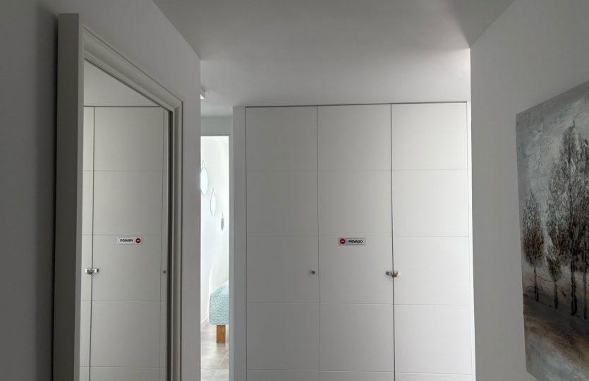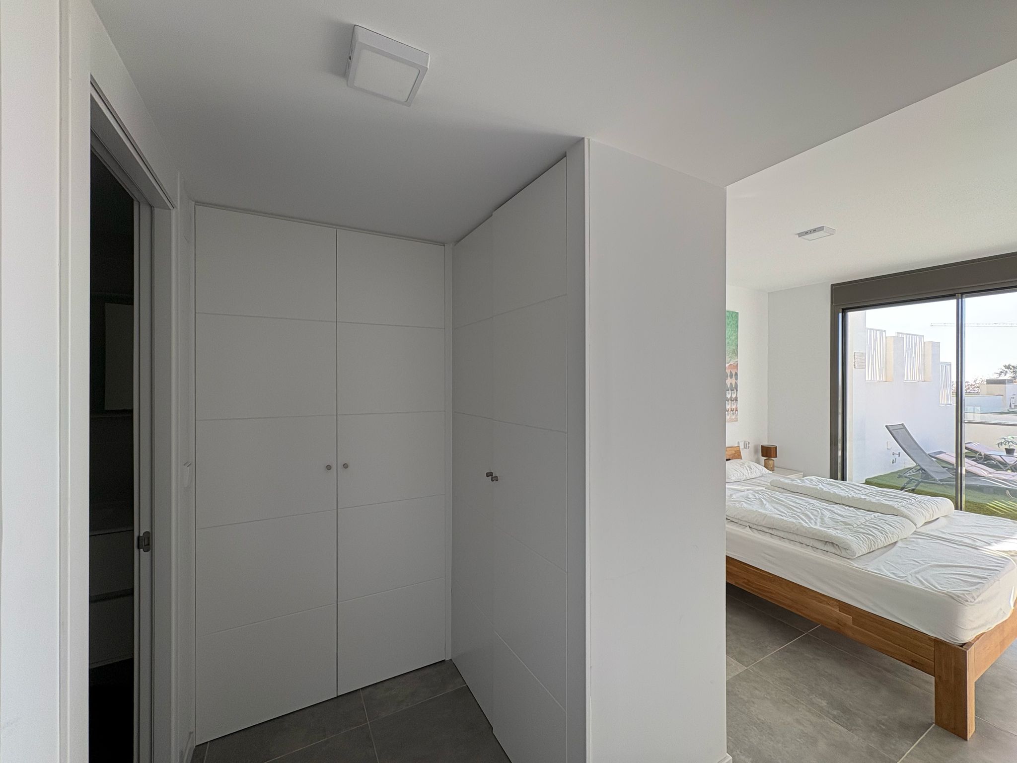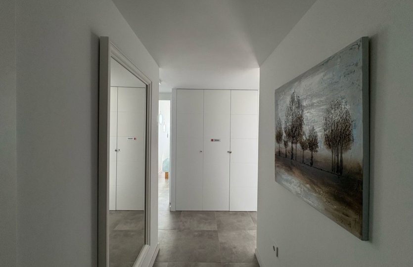 De woning bestaat uit 2 slaapkamers en 2 badkamers. De hoofdslaapkamer is en-suite, heeft directe toegang tot het terras en een ruime inloopkast. De tweede slaapkamer heeft ingebouwde kasten.