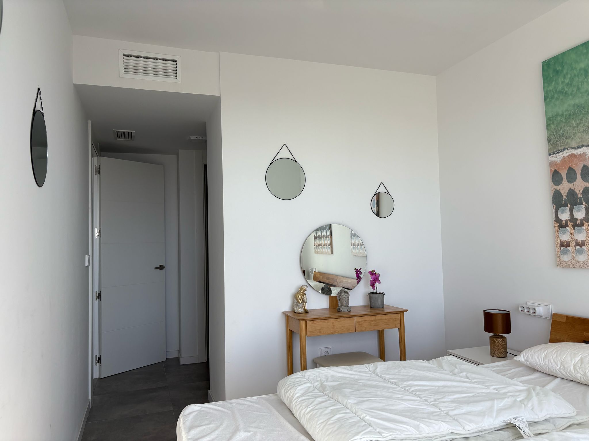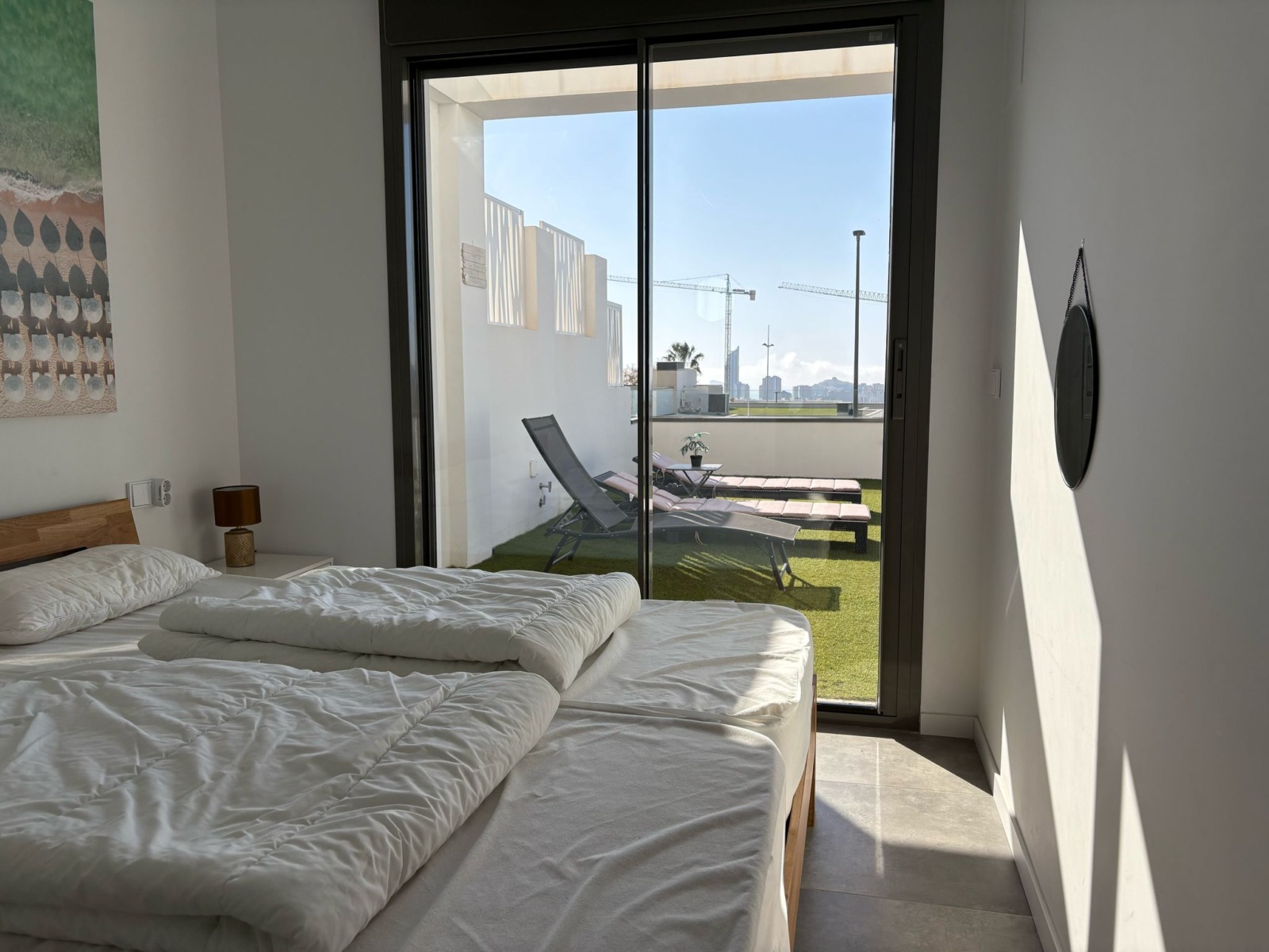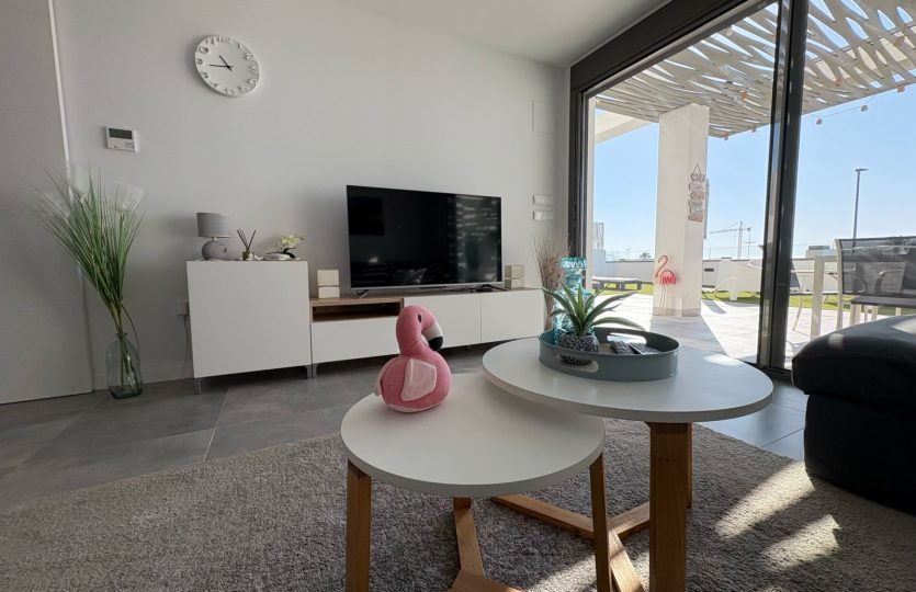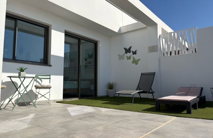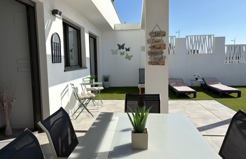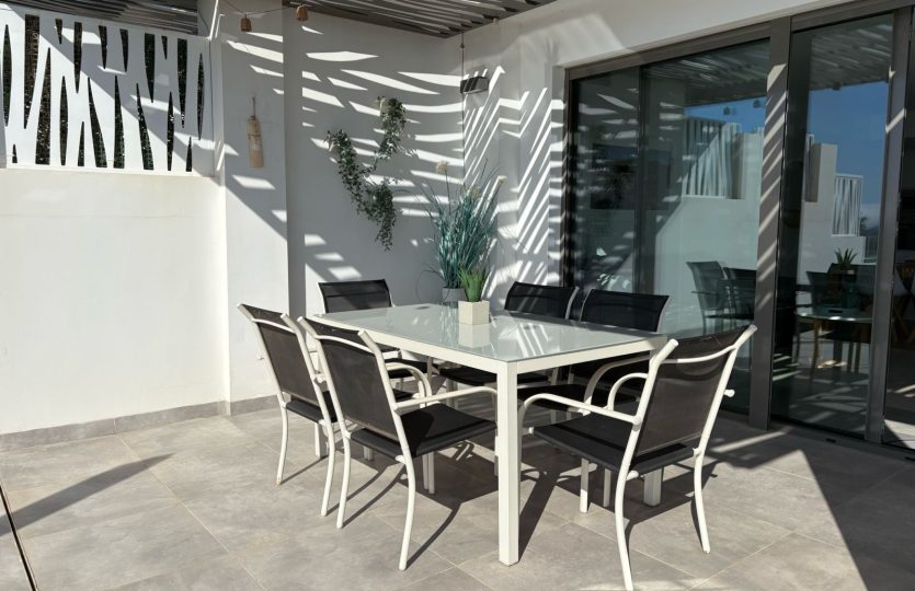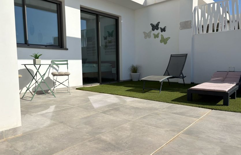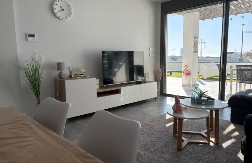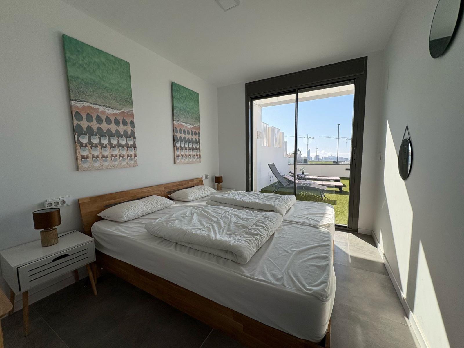 De woning bestaat uit 2 slaapkamers en 2 badkamers. De hoofdslaapkamer is en-suite, heeft directe toegang tot het terras en een ruime inloopkast. De tweede slaapkamer heeft ingebouwde kasten.