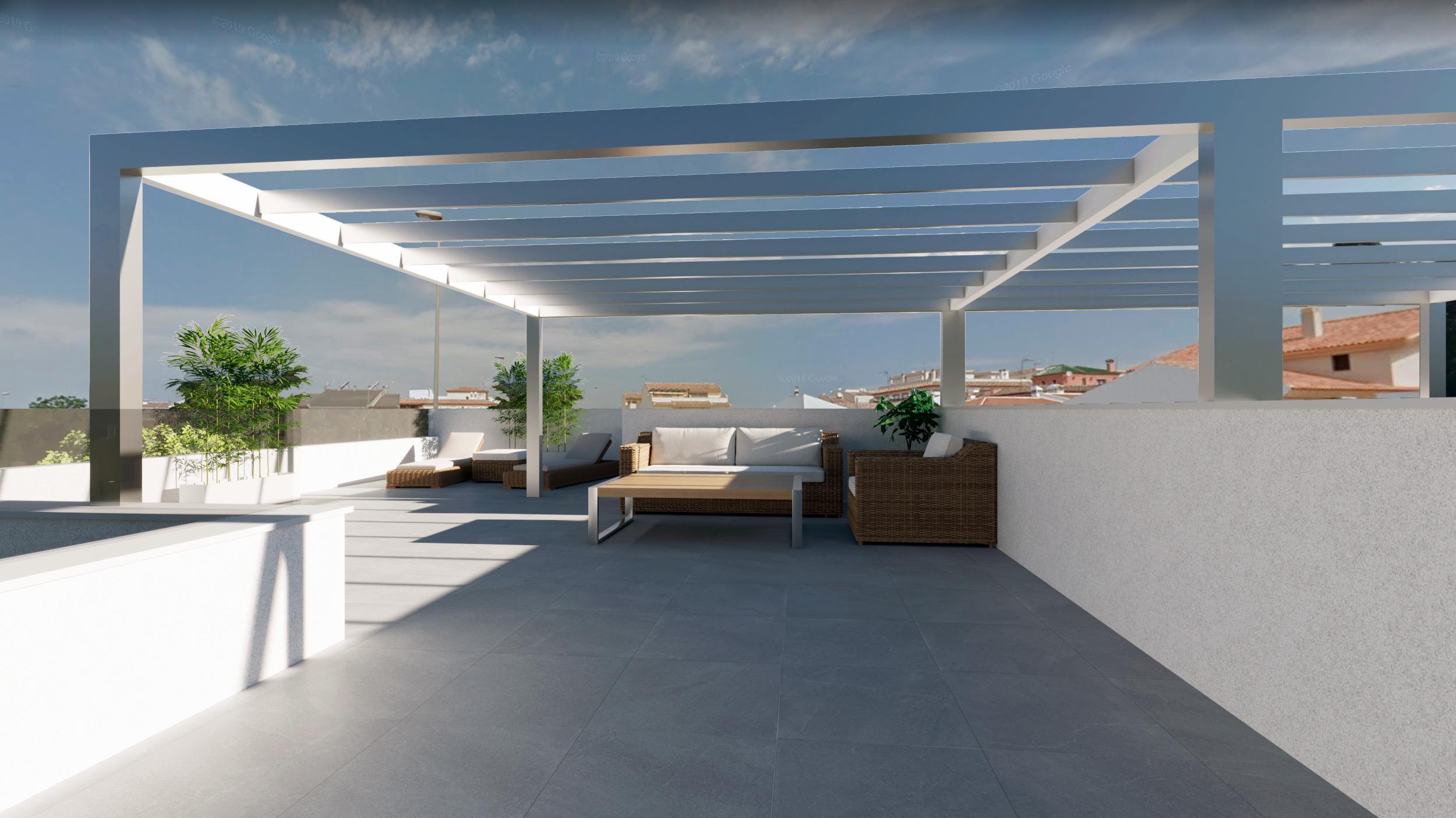 De buitenruimtes bestaan uit een gemeenschappelijk zwembad met ontspanningsruimte met ligstoelen, een dakterras of een privétuin.