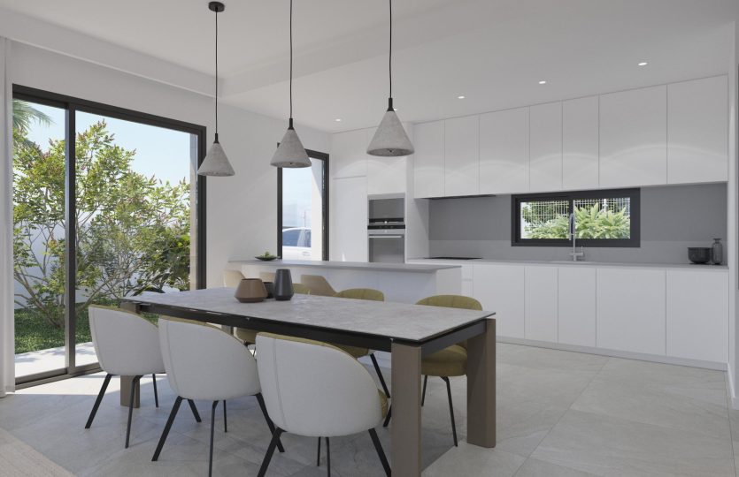 De keuken heeft een modern design en biedt directe toegang tot het zwembad en het terras, waar u kunt genieten van zonnige dagen die kenmerkend zijn voor het mediterrane klimaat.