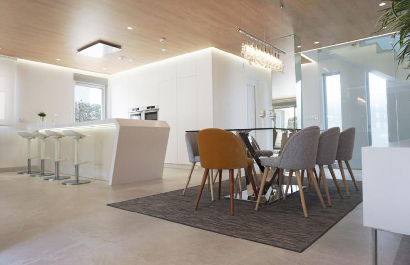 De begane grond bestaat uit een grote open eetkamer-woonkamer-keuken met directe toegang tot de tuin, het zwembad en het terras. De keuken is volledig uitgerust met meubels en apparatuur. We kunnen op deze verdieping ook een slaapkamersuite en een toilet vinden.