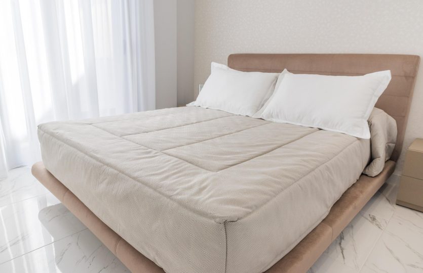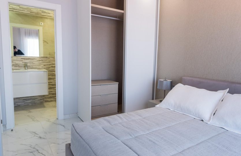 De slaapkamers zijn de hele dag ruim en licht, met op maat gemaakte inbouwkasten, gelakt in wit hout.